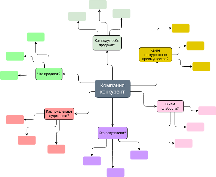 По веткам можно распределить конкурентов, особенности продукта или услуги, тренды.