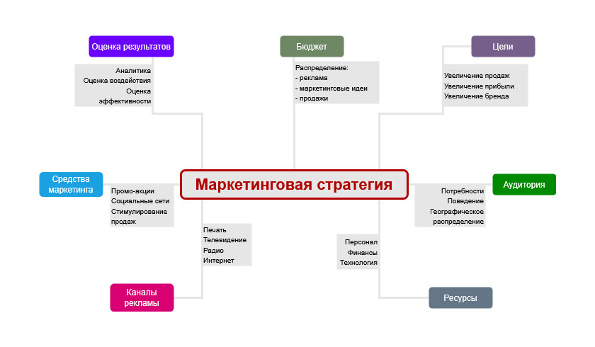Область применения интеллект-карт для решения различных задач и создания проектов в маркетинге очень широкая. С помощью интеллект-карт можно проработать и визуализировать все ключевые элементы стратегии: цели, сегменты аудитории, каналы рекламы, бюджет, показатели эффективности. Это помогает собрать целиком всю систему, исключить дублирование задач, быстро редактировать. Удобно работать с одной картой, но также ветви третьего уровня можно дополнять ссылками на дополнительные интеллект-карты, чтобы не перегружать.