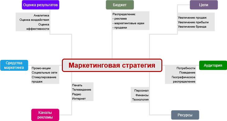 Область применения интеллект-карт для решения различных задач и создания проектов в маркетинге очень широкая. С помощью интеллект-карт можно проработать и визуализировать все ключевые элементы стратегии: цели, сегменты аудитории, каналы рекламы, бюджет, показатели эффективности. Это помогает собрать целиком всю систему, исключить дублирование задач, быстро редактировать. Удобно работать с одной картой, но также ветви третьего уровня можно дополнять ссылками на дополнительные интеллект-карты, чтобы не перегружать.