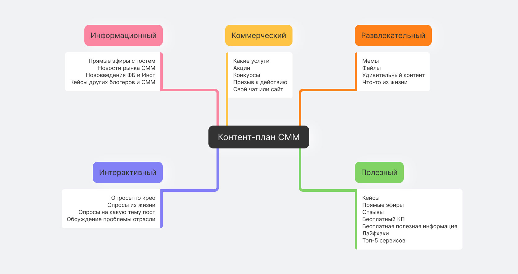 Как и в случае с разработкой стратегии, лучше использовать древовидную или радиальную структуру.Дополнительно под каждым каналом спускаясь по уровням интеллект-карты можно добавить форматы выпуска контента, даты выпуска, описать исполнителей и ответственные контролирующие лица. Это поможет координировать работу всей команды и отслеживать прогресс.