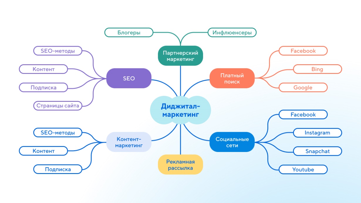 Удобно использовать радиальный или древовидный тип интеллект-карт – для логичной разбивки по направлениям и этапам.